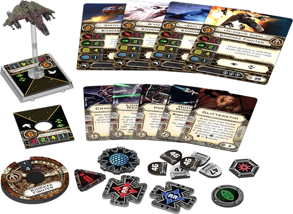 Der neue Flieger kommt mit einigen neuen Karten, die für AB, aber auch für andere Fraktionen interessant sein könnte. Gedacht von FFG ist wohl ein X-Wing Raumjäger für die AB-Fraktion. Talonbane Cobras Fähigkeit den Bonus bei Verteidigung und Angriff zu verdoppeln ist sehr spannend, aber das Manöverrad ist etwas sperrig. Die Karten Glitzerstim, Meisterhafter Schuß und Blitzschnelle Reflexe werden wir öfters sehen und vorallem Glitzerstim, ein einmaliger aber mächtiger Superfokus kann das Spiel nachhaltig verändern. Beim Kirhaxz ist die Karte Jagdinstinkt dabei, die bisher nur beim Jagdbomber dabei war.